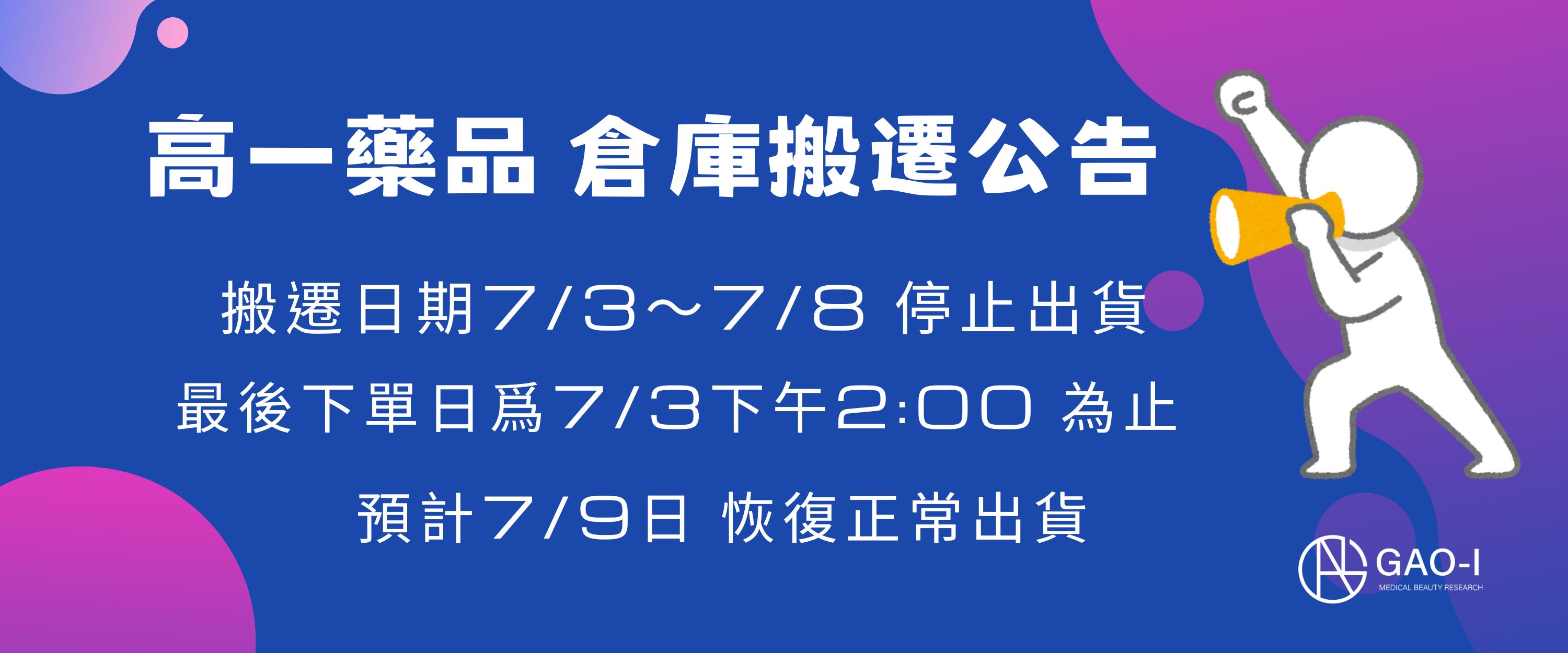 倉庫搬遷公告 搬遷日期 07/03〜07/08 停止出貨 營業出貨時間通知如下: 搬遷後訂單量較多, 届時以下單時間依序出貨.無法指定配送日期,時段。 若有急單煩請藥師提早備藥 因應疫情變