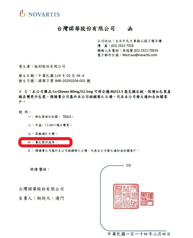 可得安穩80/12.5毫克 包裝變更通知 諾華新增第二條生產線,往後2條線 會同時併行且交替出貨,所以2種包裝 也是並存