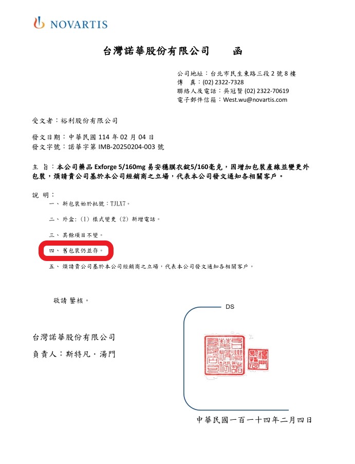 易安穩5/160毫克 包裝變更通知 諾華新增第二條生產線,往後2條線 會同時併行且交替出貨,所以2種包裝 也是並存