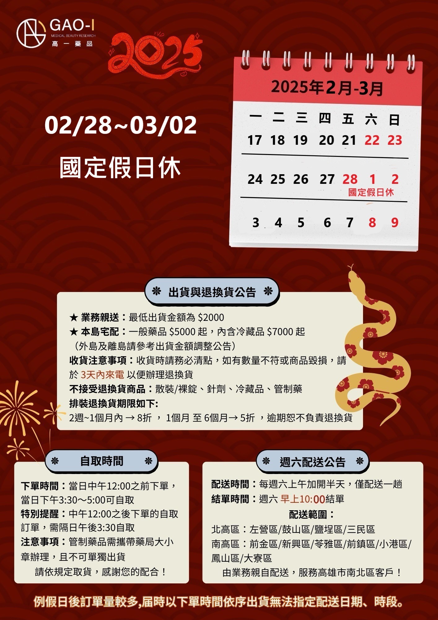 5/1(四) 5/1勞動節休 5/30(五)~06/01(日) 端午節連假休(本週六南北高暫停配送) 每週六上午 加開半天 由業務親送區 為"高雄市 南北區"