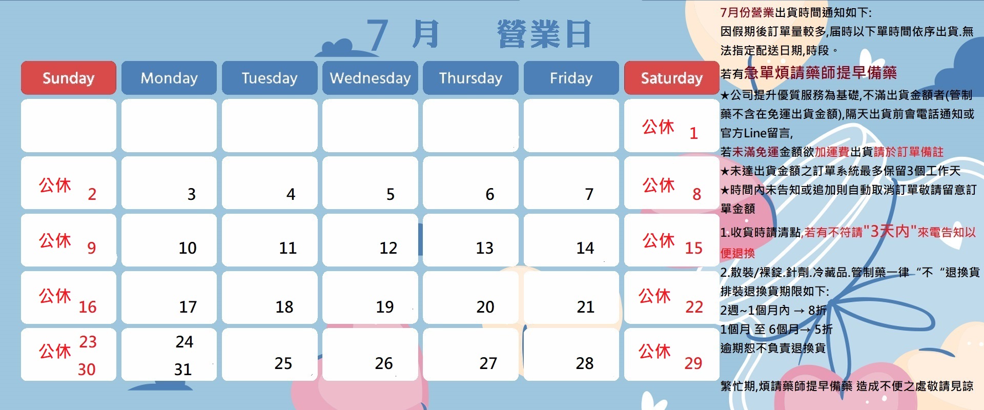 【營業時間公告】7月份營業日