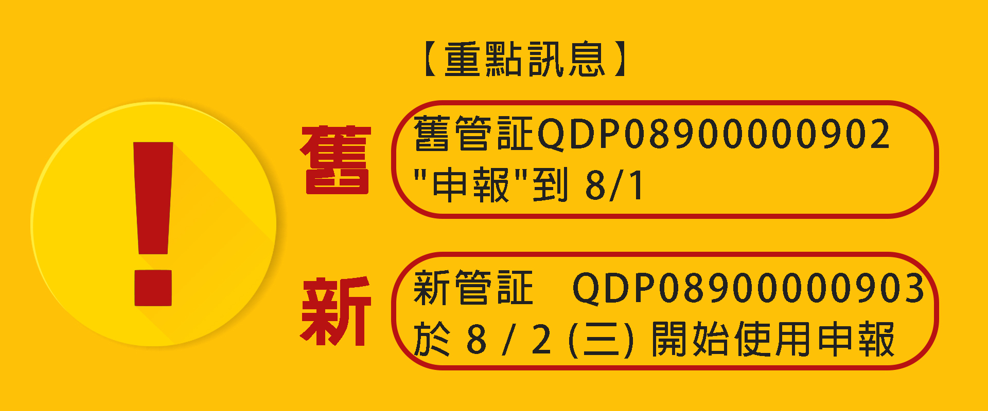 【重點訊息】 舊管証QDP08900000902 "申報"到 8 / 1 新管証 QDP08900000903 於 8 / 2 (三)