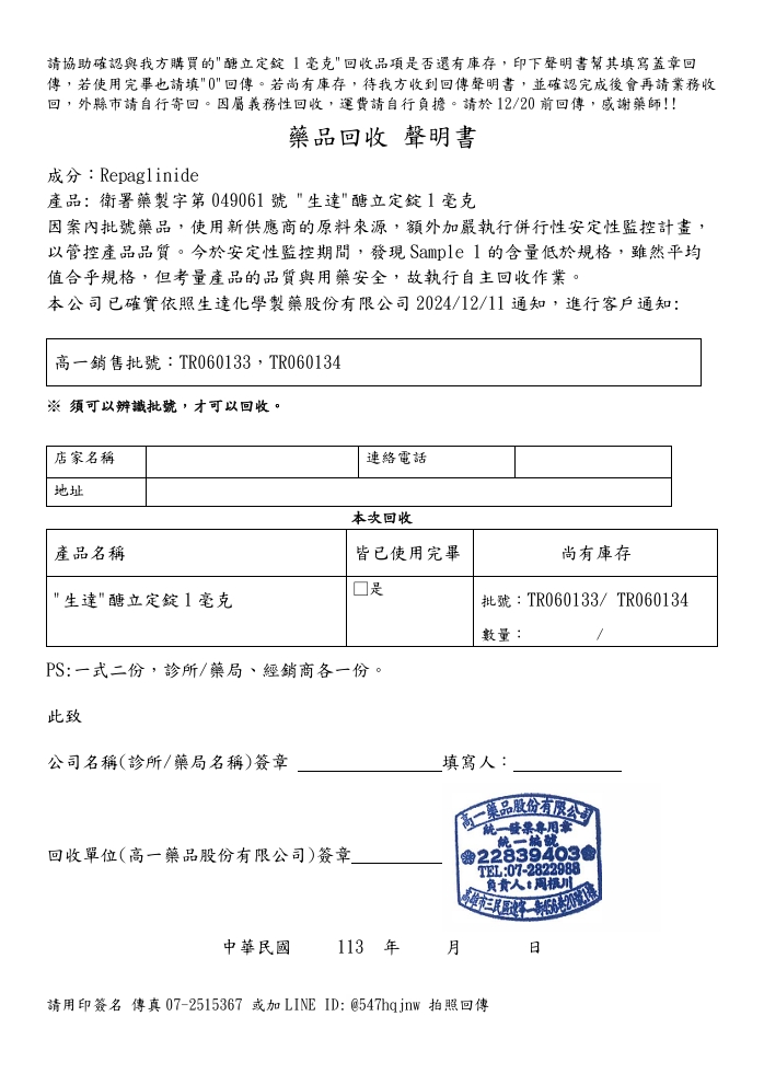 依照113/12/11生達藥廠通知,因案內批號藥品,使用新供應商的原料來源。於安定性監控期間,發現Sample 1的含量低於規格,雖然平均值合乎規格,但考量產品的品質與用藥安全,故執行自主回收作業。
