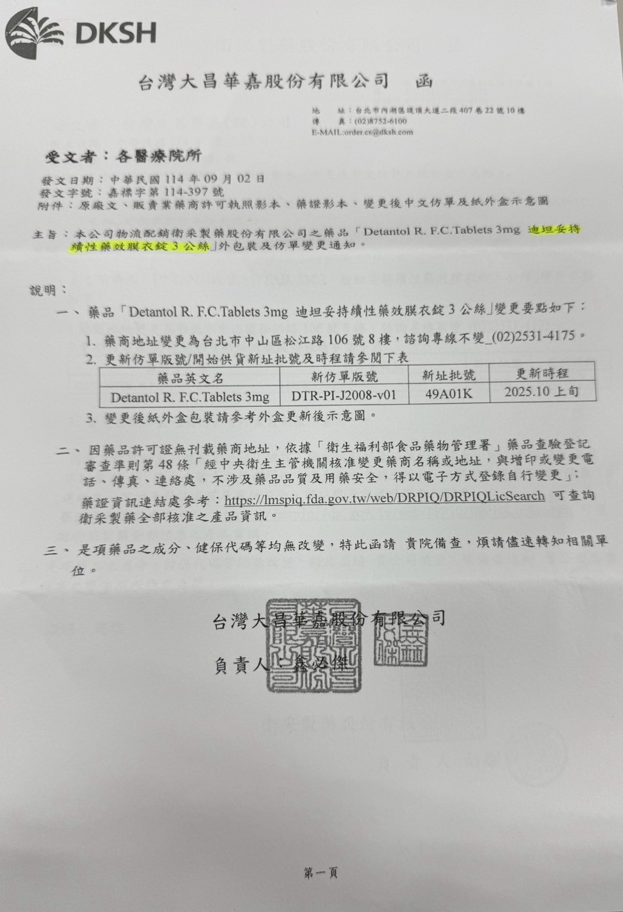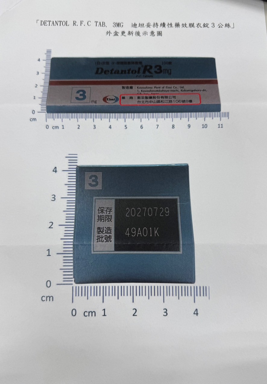 【包裝外觀變更公告】 迪坦妥持續性藥效膜衣錠3公絲 包裝及仿單變更通知