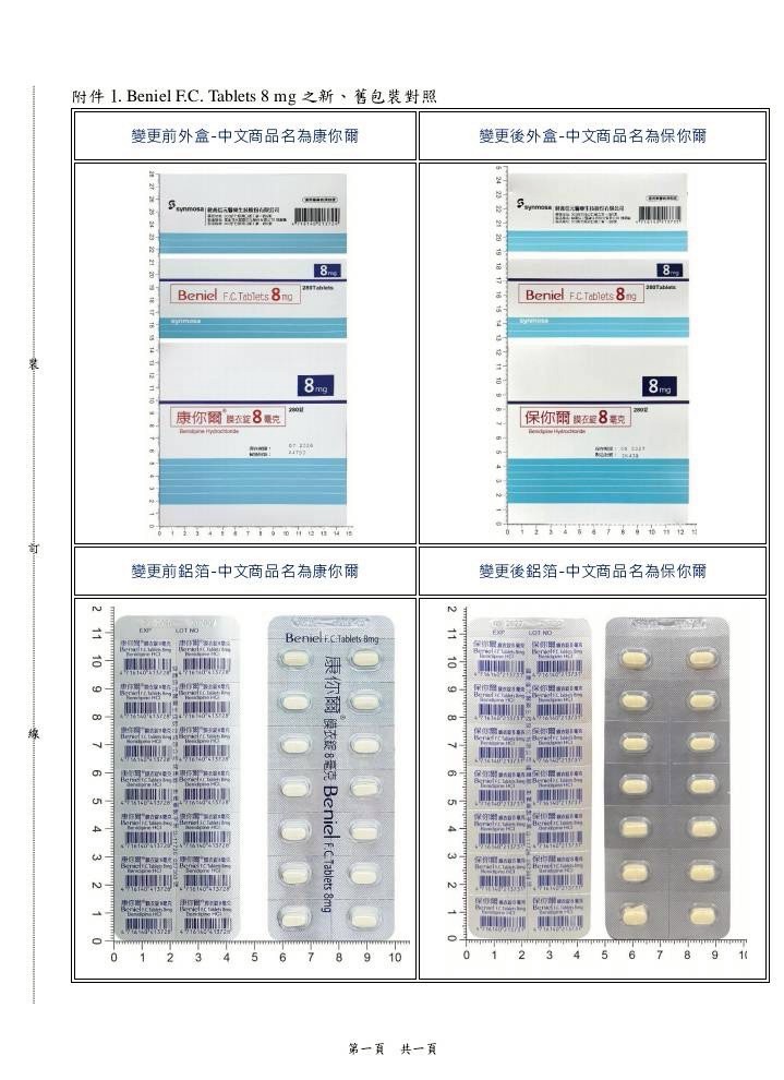 【包裝外觀變更公告】 康你爾膜衣錠8毫克 更改名稱 保你爾膜衣錠8毫克