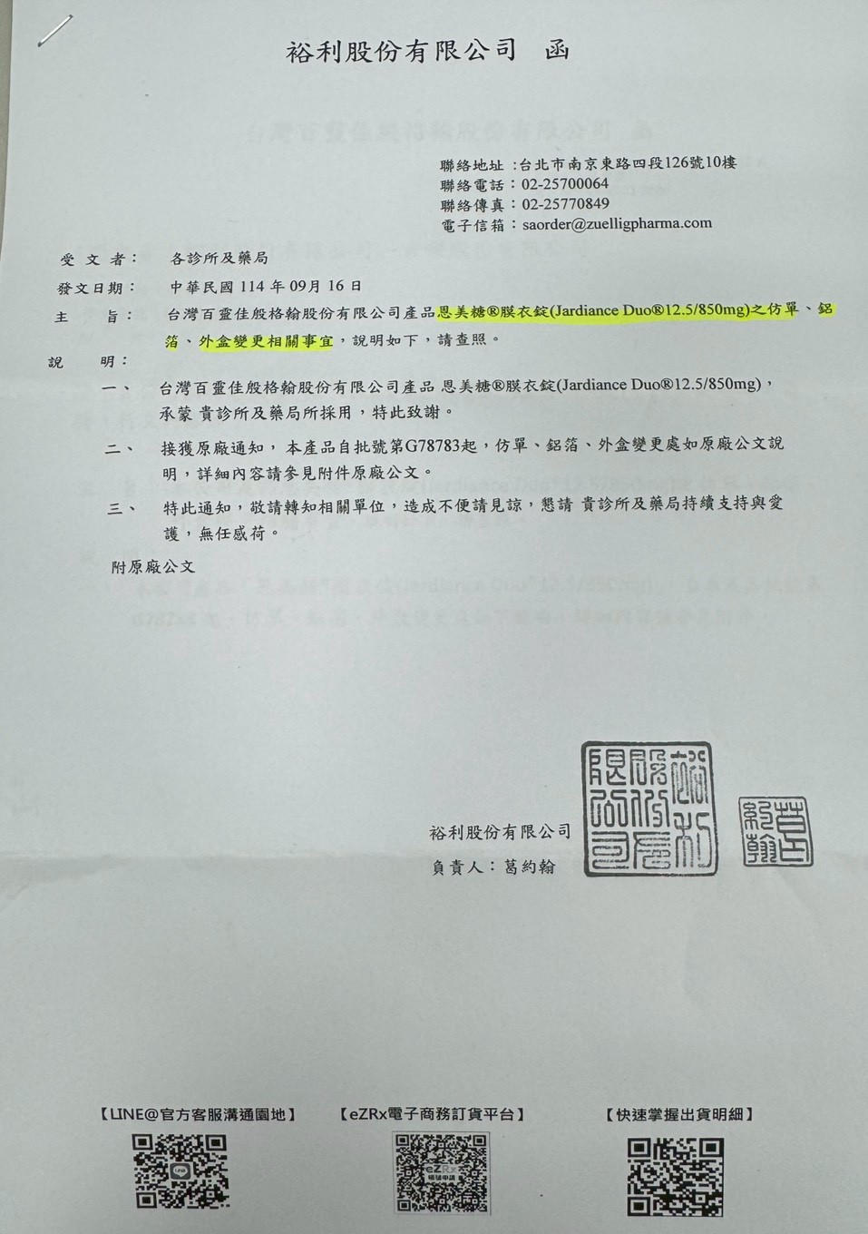 【包裝外觀變更公告】恩美糖膜衣錠12.5/850MG 仿單/鋁箔/外盒變更