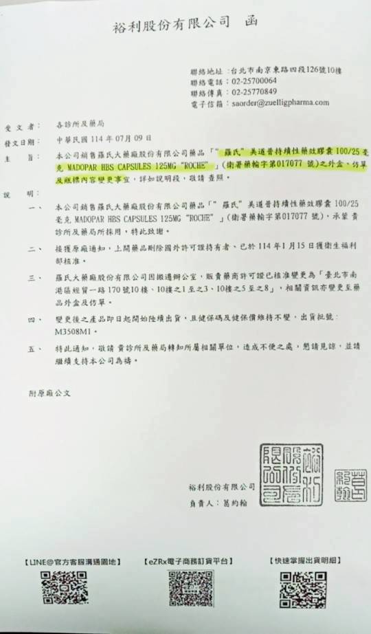 【包裝外觀變更公告】 “羅氏”美道普持續性藥效膠囊100/25毫克 之外盒、仿單及瓶標內容變更